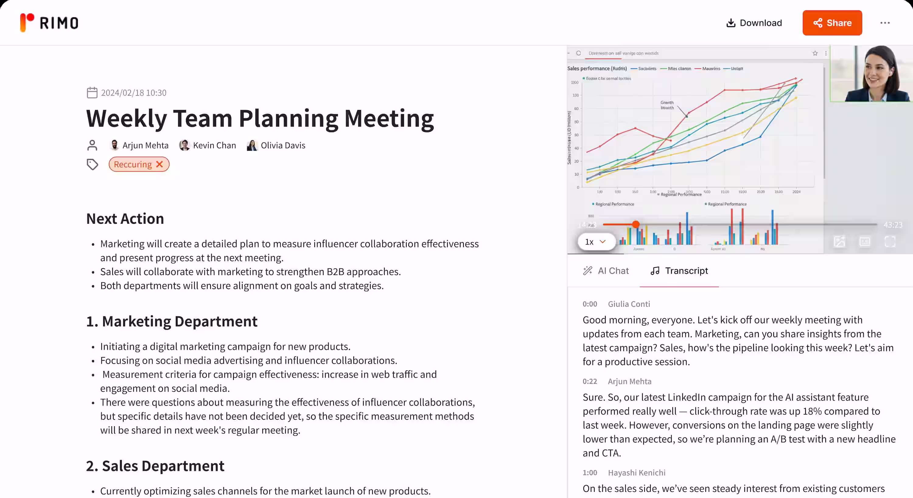Go beyond raw transcripts. Rimo helps you prepare AI agendas, follow the discussion in real time, and surface meeting insights so recurring calls actually lead to better decisions.